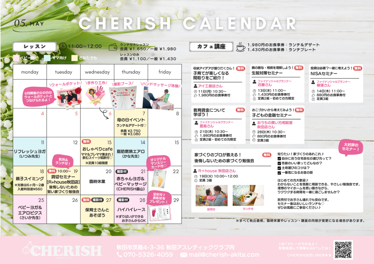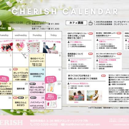 親子のふれあいに、リフレッシュにCHERISHに遊びにきませんか?5月も内容盛りだくさんです💡